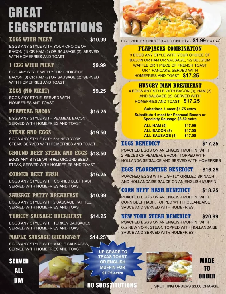 Omelettes, skillets, breakfast platters & combos, waffles to flapjacks, all day long! Affordable & delicious!
