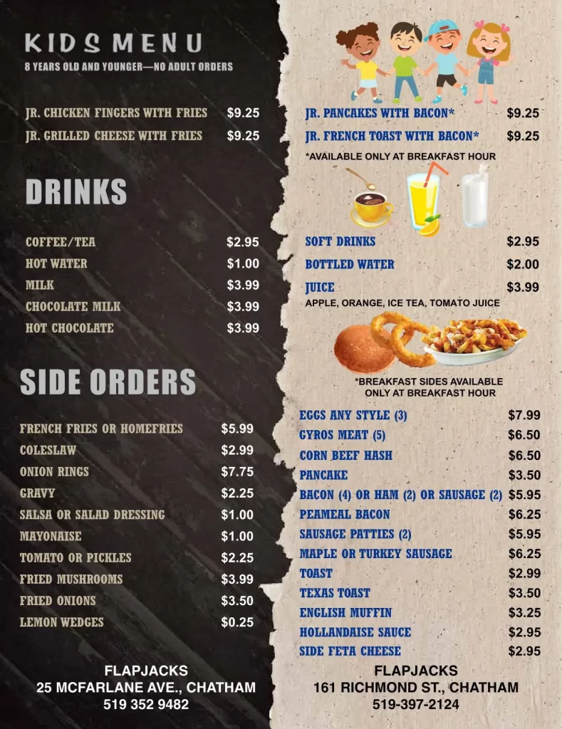 Locally owned and operated, serving all of Chatham-Kent, Flapjacks Lunch Shack is the go to place for all day breakfast, and affordable family dining. See for yourself why our customers are repeat customers. We kindly invite you to dine at one of our 2 Chatham-Kent locations, ready to serve you. We aim to give you a positive & pleasurable dining experience each time you come in.